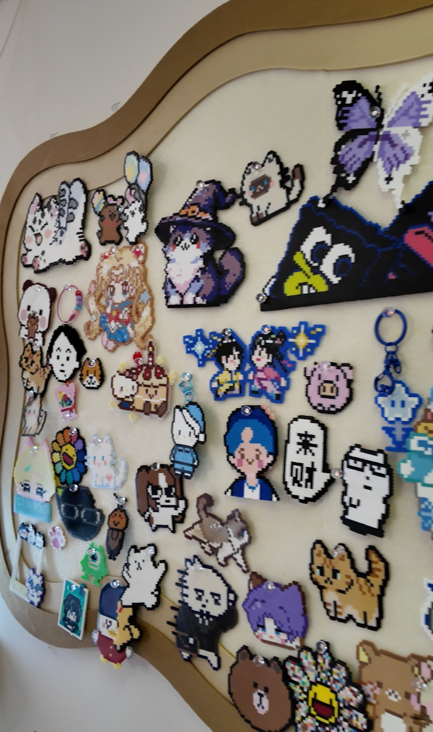 消费者小陈是典型用户画像——大学生,因室友接触拼豆后入坑,目前已拼出多个作品,冰箱贴全是自制。“大概两个月来一次,单次消费50元以内。很解压,拼完特别有成就感。”她拼一个大图耗时两个半小时,“像这个是要做成开关装饰的,放在家里看着心情就好。”小陈指着一张构色非常复杂的拼豆作品。
