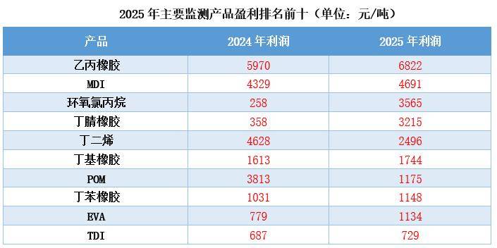 在金联创监测利润的78个品种中,2025年有47个品种盈利,占比60.26%,另外31个品种出现理论亏损,占比39.74%,2024年有45个品种盈利,占比57.69%,另外33个品种出现理论亏损,占比42.31%,2023年有41个品种盈利,占比53.85%,另外36个品种出现理论亏损,占比46.15%,1个品种利润为0。2025和2024年盈利品种个数相差不大,约6成产品盈利,近5成产品利润同比2024年不同程度减少。乙丙橡胶、MDI、POM利润排名依然靠前,但情况各异,乙丙橡胶和MDI利润同比上升,POM利润同比大幅减少;EVA利润再度上涨,进入利润排名前十;值得一提的是,盈利排名前十中橡胶占了5个名额。亏损榜单中,纯苯下游和塑料行业仍然占据前十主力,己内酰胺2025年亏损加剧,进入榜首;乙二醇亏损略有减轻,但依然位居亏损榜单第二名。